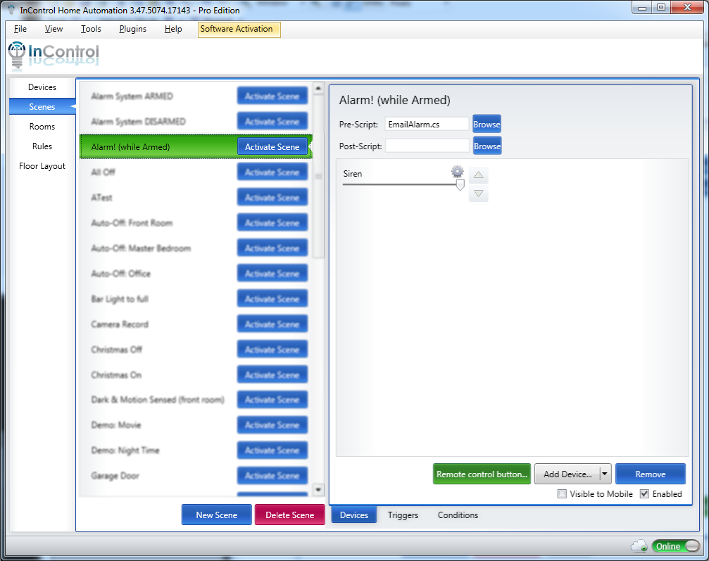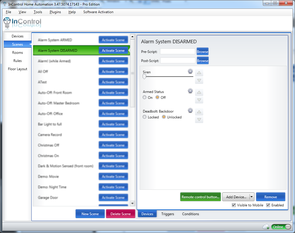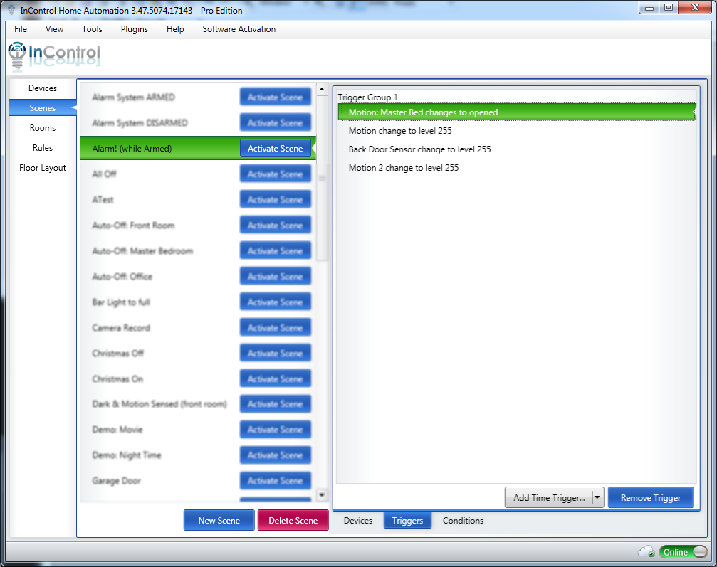 This tutorial will discuss how to setup InControl to function as an self-monitored alarm system. We'll take advantage of InControl's Virtual Devices to keep track of the status of the system. 3 scenes will be utilized to monitor motion and door sensors and to sound the alarm or send an email when something doesn't seem quite right.